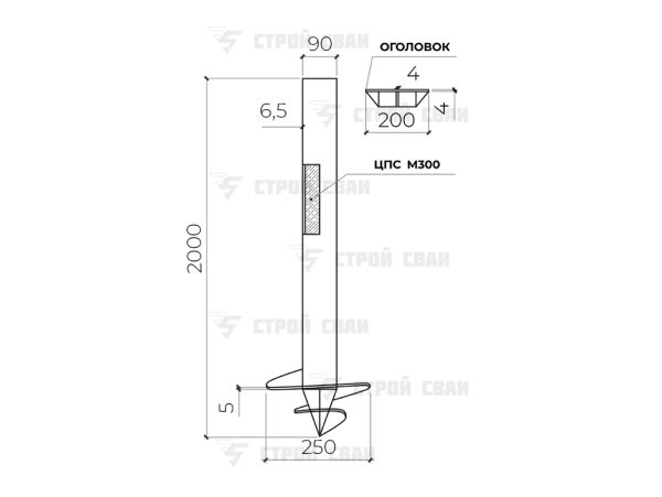 Конструкция СВС 90/2000/6,5 ничем не отличается от изделий других типоразмеров: это стальная труба определенной длины и диаметра, на нижнем конце которой сформирован острый наконечник с закрепленной при помощи сварки спиральной лопастью. Благодаря балансу параметров каждый столб обладает высокой прочностью и несущей способностью.